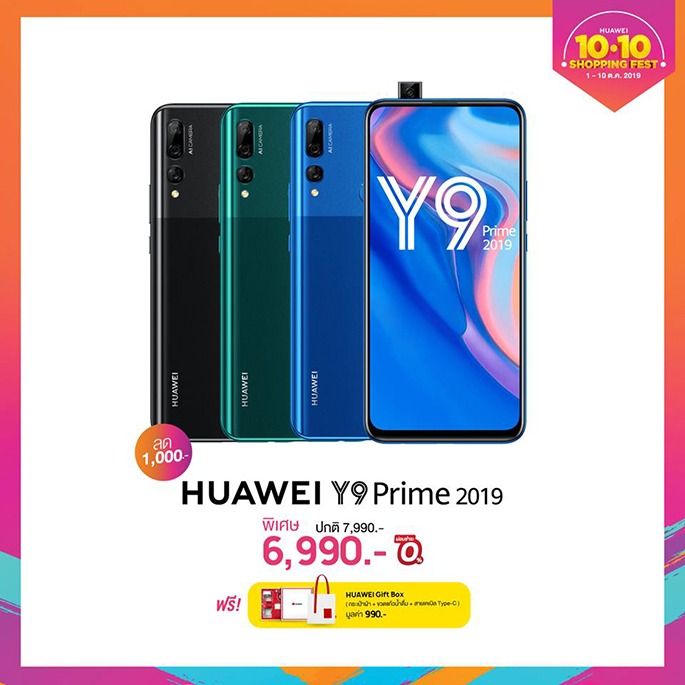 - HUAWEI Y9 Prime 2019 สมาร์ทโฟนกล้องหน้าป๊อปอัพ 16 ล้านพิกเซล จอใหญ่ไร้ติ่งไร้ขอบด้วย HUAWEI Ultra FullView Display ที่จะสร้างความเพลิดเพลินด้วยความบันเทิงแบบเต็มรูปแบบ ที่มาพร้อมราคาเบาๆ เพียง 6,990 เท่านั้น! และรับของสมนาคุณพิเศษ HUAWEI Gift Box มูลค่า 990 บาท ฟรี!