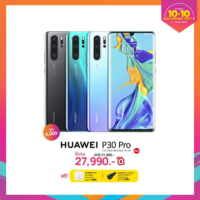 - HUAWEI P30 Pro รุ่นเรือธงยอดนิยม สุดยอดสมาร์ทโฟนที่ฉีกทุกกฏเกณฑ์ของการถ่ายภาพ ด้วยคุณสมบัติการถ่ายภาพชั้นเลิศจากกล้อง Leica Quad camera system ในราคา 27,990 และ HUAWEI P30 มาพร้อม Leica Triple camera สามารถเติมเต็มทุกๆ จินตนาการด้านการถ่ายภาพในราคา 17,990 บาท รับของสมนาคุณสุดคุ้ม HUAWEI body Fat Scale เครื่องชั่งน้ำหนักอัจฉริยะวัดได้ทั้งน้ำหนักและมวลไขมัน มูลค่า 1,990 และHUAWEI SuperChargeTM Car Charger มูลค่า 1,290 บาท