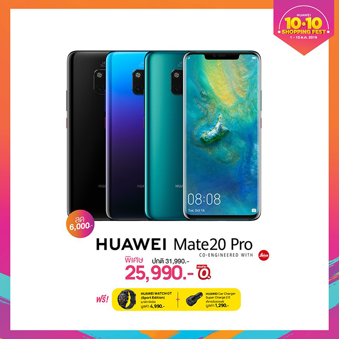 - HUAWEI Mate 20 Pro สมาร์ทโฟนรุ่นเรือธงที่ได้ชื่อว่าเป็นที่สุดของการผสานเทคโนโลยีชั้นนำจากหัวเว่ยกับงานออกแบบที่ไม่เหมือนใคร กับราคาพิเศษ 25,990 บาท พร้อมรับฟรีทันที HUAWEI Watch GT มูลค่า 4,990 บาท และ HUAWEI SuperChargeTM Car Charger มูลค่า 1,290 บาท