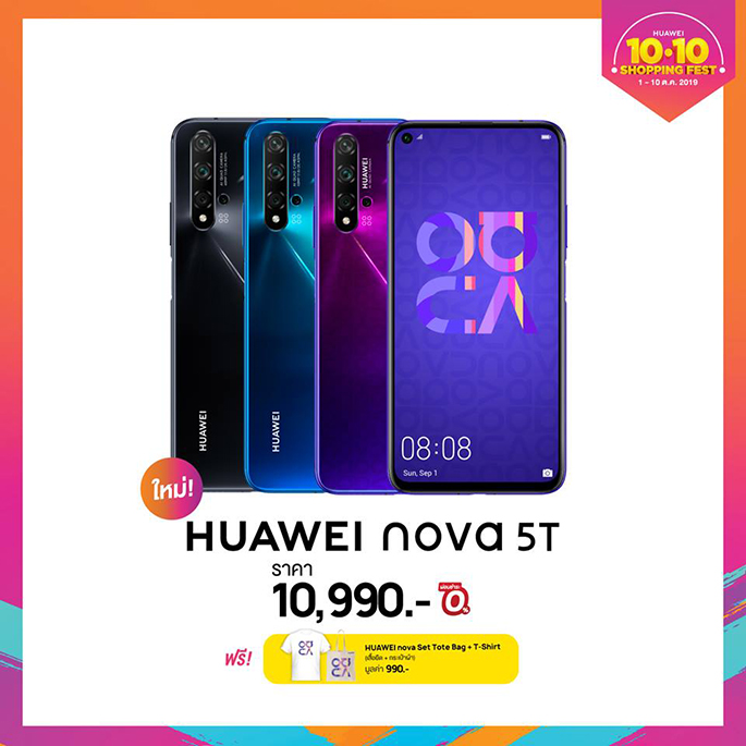 - HUAWEI nova 5T สมาร์ทโฟนขุมพลังแฟลกชิป สเปคแน่น มาพร้อมนวัตกรรม 5 กล้อง และดีไซน์แบบใหม่สดใสไม่ซ้ำใคร เอาใจวัยมันส์ นับเป็นรุ่นใหม่ล่าสุดที่เพิ่งเปิดตัวในไทยและได้รับการตอบรับอย่างดีเยี่ยมในชั่วข้ามคืน ในราคาเพียง 10,990 บาท พร้อมรับของสมนาคุณ HUAWEI nova Set มูลค่า 990 บาท