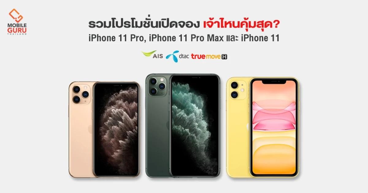 iPhone 11 Pro, iPhone 11 Pro Max และ iPhone 11 สมาร์ทโฟนรุ่นใหม่ของ Apple เปิดให้สั่งจองล่วงหน้าได้แล้วตั้งแต่วันที่ 11 ต.ค. 2562 เวลา 00:01 น. - 15 ต.ค. 2562 เวลา 12:00 น. แต่ละเครือข่ายต่างจัดโปรโมชั่นสุดพิเศษเพื่อเอาใจสาวกแอปเปิ้ลโดยเฉพาะ ไม่ว่าจะเป็นผ่อน 0% ได้นานสูงสุด 48 เดือน กับบัตรเครดิตที่ร่วมรายการ หรือรับส่วนลดได้ทันทีโดยที่ไม่ต้องจ่ายค่าบริการล่วงหน้า ก่อนที่จะตัดสินใจสั่งซื้อล่วงหน้า เรามาดูกันดีกว่าว่า เอไอเอส, ดีแทค และ ทรูมูฟ เอช แต่เจ้าจัดโปรโมชั่นอะไรได้โดนใจกันบ้าง