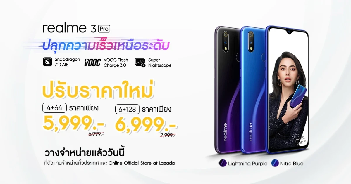 - realme 3 Pro ความจุ 6+128 เหลือเพียง 6,999 บาท (จากปกติ 7,999 บาท) ที่ตัวแทนจำหน่ายทั่วประเทศ