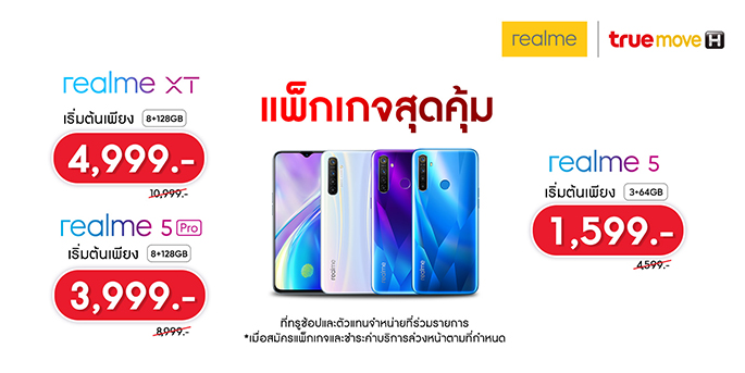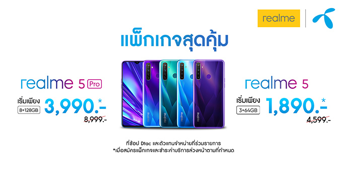 - realme 5 Pro รุ่นความจุ 8 + 128 GB เริ่มต้นที่ 3,990 บาท (จากราคาปกติ 8,999 บาท) โดยจะต้องสมัครแพกเก็จ 899 บาท