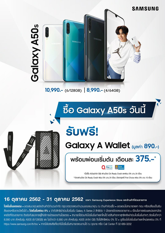 ปิดท้ายด้วยโปรโมชั่นสุดพิเศษ เมื่อซื้อ Galaxy A50s รุ่นใดก็ได้วันนี้ รับฟรี! Galaxy A Wallet สุดเท่ มูลค่า 890 บาท และโปรผ่อนแรงแห่งปี เริ่มต้นเพียง 375 บาทต่อเดือน เมื่อซื้อ Galaxy A50s รุ่น RAM 4GB / ROM 64GB ผ่านบัตร Citi Ready Credit และผ่อน 0% นาน 24 เดือน หรือผ่อน 0% นาน 10 เดือนเมื่อชำระผ่านบัตรกรุงศรี First Choice ตั้งแต่วันที่ 16 - 31 ตุลาคม 2562 ที่ ซัมซุง เอ็กซ์พีเรียนซ์ สโตร์ และร้านค้าที่ร่วมรายการ สามารถติดตามเงื่อนไขโปรโมชั่นเพิ่มเติมได้ที่เว็บไซต์ www.samsung.com/th/tnc