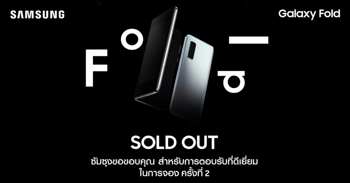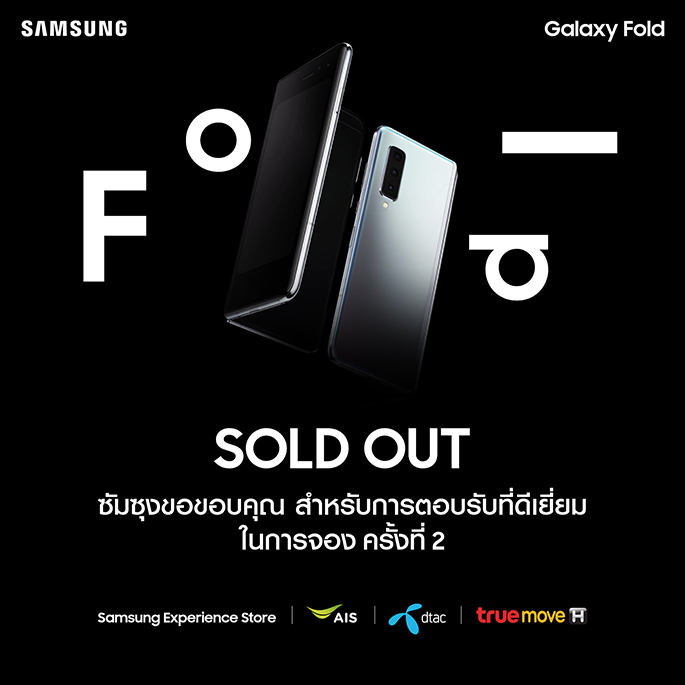 Samsung ขอบคุณสำหรับการตอบรับที่ดีเยี่ยมของคนไทยที่มีต่อ Samsung Galaxy Fold โดยในฐานะที่ประเทศไทยเป็นประเทศประเทศอันดับต้นๆ ของโลกที่ได้รับเลือกให้วางจำหน่ายอย่างเป็นทางการ ทำให้จำนวน Galaxy Fold ที่นำเข้ามาในประเทศไทยมีจำนวนจำกัด ซึ่งจากกระแสตอบรับของลูกค้าในประเทศไทยในการเปิดจองครั้งแรก รวมถึงความประทับใจในความพรีเมี่ยมและนวัตกรรมที่โดดเด่น จากลูกค้าที่ได้รับเครื่องไปเมื่อวันที่ 16 ตุลาคมที่ผ่านมา ทำให้เชื่อมั่นว่า Galaxy Fold จะเป็นสมาร์ทโฟนที่มอบประสบการณ์ที่ดีที่สุดที่เคยมีมา ทั้งนี้ ซัมซุงจะดำเนินการจัดหาสินค้าเพิ่มเติมโดยเร็ว เพื่อรองรับความต้องการของลูกค้าให้ดีที่สุด