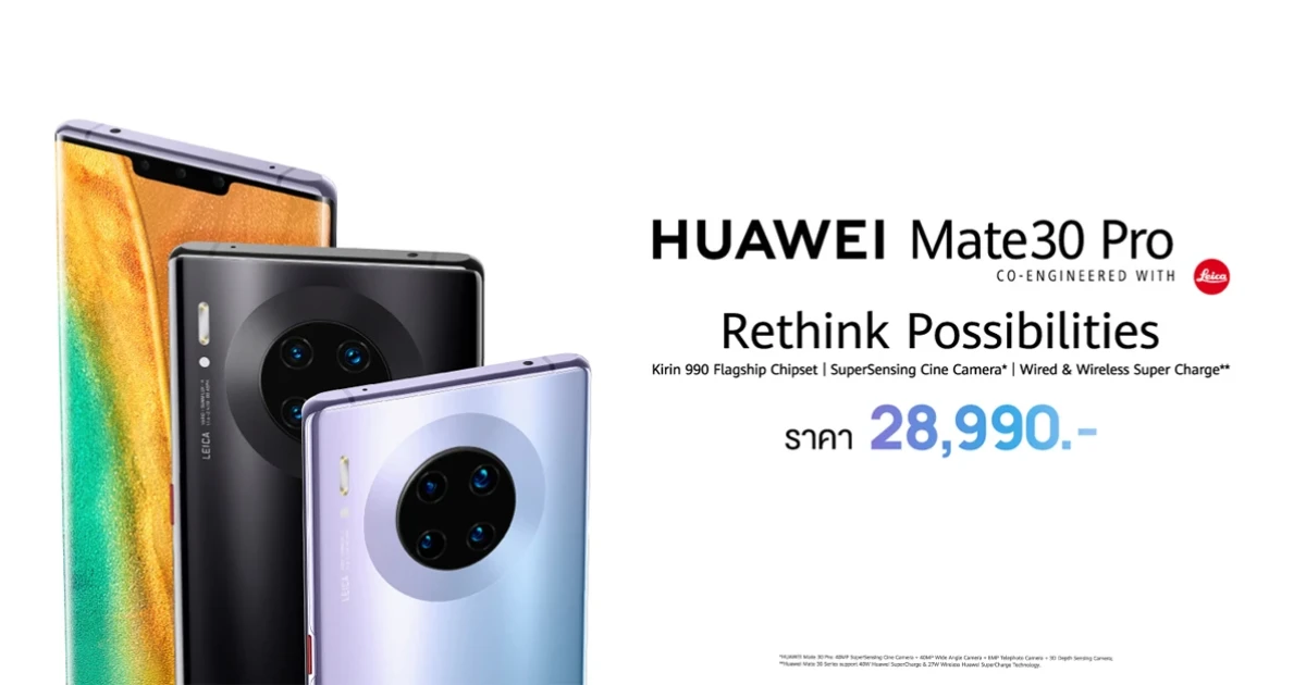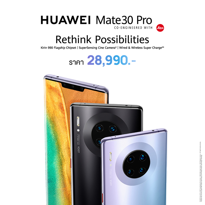 HUAWEI Mate 30 Pro สมาร์ทโฟนแฟลกชิปที่จะมาสร้างมาตรฐานใหม่ทั้งนวัตกรรมฮาร์ดแวร์อันทรงพลังและการออกแบบที่นำสมัยซึ่งผสมผสานกันได้อย่างลงตัว วางจำหน่ายทั่วประเทศแล้ววันนี้ ในราคา 28,990 บาท