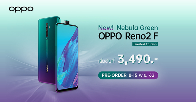 OPPO มอบโปรโมชั่นพิเศษ OPPO Reno2 F - Nebula Green Limited Edition ในราคาเริ่มต้น 3,490 บาท