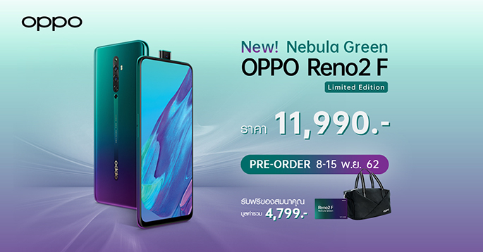 OPPO Reno2 F Nebula Green Limited Edition พร้อมพรีออเดอร์ได้ตั้งแต่วันที่ 8 - 15 พฤศจิกายน นี้ ในราคา 11,990 บาท พร้อมรับฟรี Special gift จาก OPPO มูลค่า 4,799 บาท และพิเศษสุดๆ สำหรับผู้ที่พรีออเดอร์ผ่านผู้ให้บริการเครือข่ายที่ร่วมรายการสามารถเป็นเจ้าของ OPPO Reno2 F Nebula Green Limited Edition ในราคาเริ่มต้นเพียง 3,490 บาท