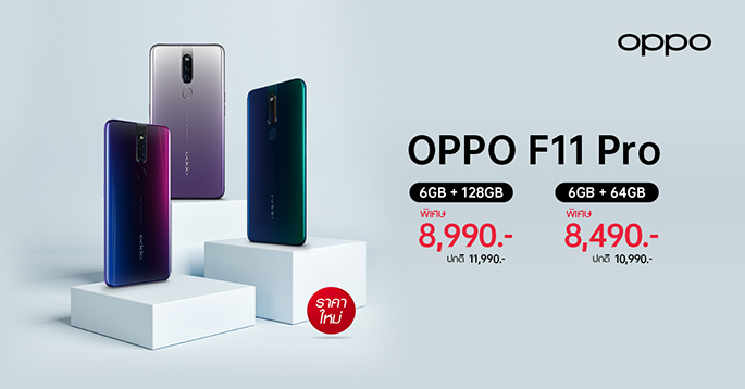- OPPO F11 Pro รุ่น 6 GB + 64 GB ปรับราคาจากเดิม 10,990 บาท เหลือเพียง 8,490 บาท