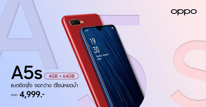 OPPO พร้อมวางจำหน่ายสมาร์ทโฟนน้องเล็ก OPPO A5s รุ่นอัพเกรด RAM 4GB/ROM 64GB จากซีรีส์ A ซึ่งถือว่าเป็นซีรีส์ที่สเปคคุ้มค่าราคาโดนใจ โดย OPPO A5s RAM 4GB/ROM 64GB มีดีไซน์ที่ทันสมัยสวยสะดุดตา หน้าจอหยดน้ำ แบตอึดสามารถใช้งานได้อย่างยาวนาน