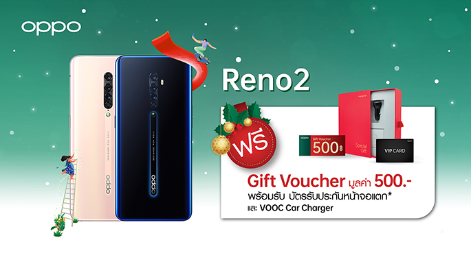 OPPO Reno2 สมาร์ทโฟนที่ถ่ายวิดีโอดีที่สุด รับฟรีของแถมพิเศษมากมายทั้ง Gift Voucher มูลค่า 500 บาท VOOC Car Charger และ VIP Card ประกันหน้าจอแตก 1 ปี เมื่อซื้อ OPPO Reno2 ในราคา 17,990 บาท โดยจุดเด่นของรุ่นนี้คือโหมดกันสั่น หรือ Ultra Steady Mode ช่วยให้การถ่ายวีดีโอนิ่งทุกสถานการณ์ มาพร้อมกล้องหลังถึง 4 ตัว ความละเอียดสูงสุด 48MP และโหมดต่างๆ ที่ช่วยให้ถ่ายภาพได้ชัดทุกระยะ ไม่ว่าจะเป็นระยะใกล้หรือไกลด้วย 5x Hybrid Zoom ซูมแบบดิจิตอลได้สูงสุดถึง 20 เท่า มืดแค่ไหนก็เอาอยู่ด้วย Ultra Dark Mode หรือแม้แต่ระยะใกล้ก็สวยชัดได้ด้วย Ultra Macro Mode ถ่ายได้ใกล้ถึง 2.5 เซนติเมตร นอกจากนี้ยังมาพร้อมชิปเซ็ต Snapdragon 730G RAM 8 GB และ ROM 256 GB โดย OPPO Reno2 มีให้เลือก 2 สี คือ สีดำ Luminous Black และสีชมพู Sunset Pink