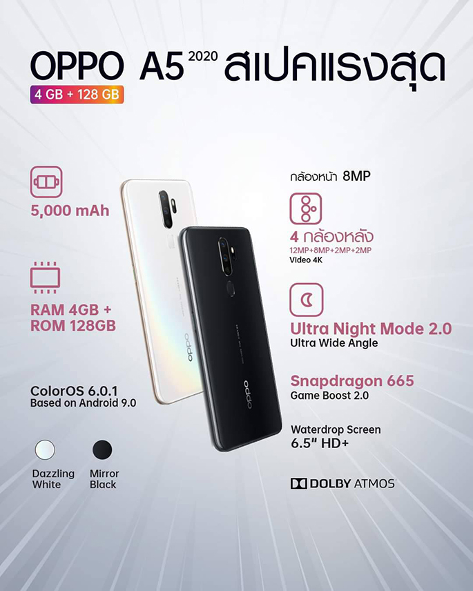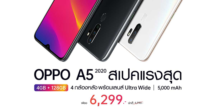 OPPO แบรนด์ผู้นำสมาร์ทโฟนในไทย ให้คุณเป็นเจ้าของ OPPO A5 2020 4GB ได้ง่ายขึ้น ด้วยราคาใหม่เพียง 6,299 บาท โดย OPPO A5 2020 4GB มาพร้อมกับกล้องหลัง 4 ตัว ความละเอียดสูงสุด 12MP สามารถเก็บภาพมุมกว้างได้ถึง 119 องศา ด้วย Ultra Wide Angle และถ่ายภาพได้อย่างคมชัดแม้ในที่แสงน้อยด้วย Ultra Night Mode 2.0 พร้อมมอบประสบการณ์การใช้งานที่ลื่นไหลด้วยชิปเซ็ต Snapdragon 665, RAM 4GB + ROM 128GB อีกทั้งใช้งานได้ยาวนานตลอดทั้งวันด้วยแบตเตอรี่ 5,000 mAh โดยสามารถชาร์จให้เครื่องอื่นได้ด้วยฟีเจอร์ Reverse Charging นอกจากนี้ยังมาพร้อมกับลำโพงสเตอริโอคู่และระบบเสียง Dolby Atmos ที่เป็นระบบเสียงเดียวกันกับโรงภาพยนตร์ระดับไฮคลาส เข้ามาเพิ่มความกระหึ่ม ความหนักแน่น เสมือนพกโรงภาพยนตร์ติดตัว