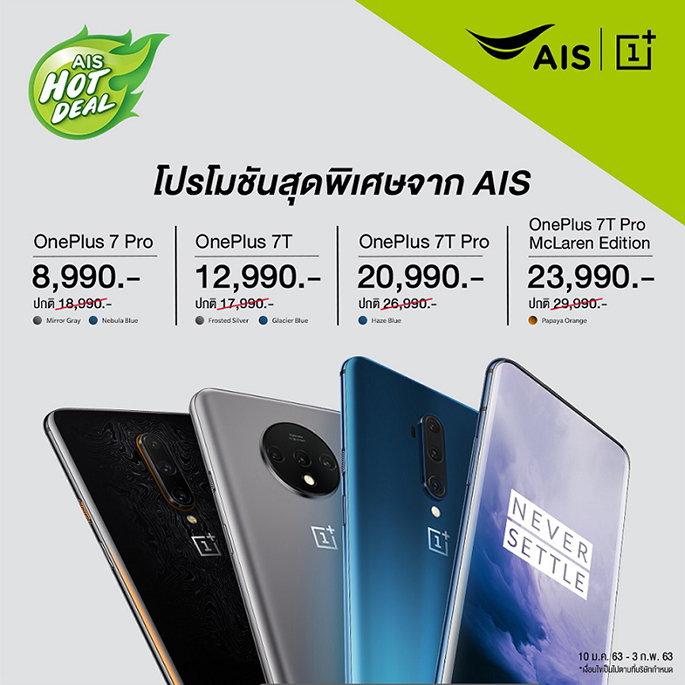OnePlus แบรนด์สมาร์ทโฟน Super Flagship สุดพรีเมียม ที่ใส่ใจทุกรายละเอียด ทั้งดีไซน์การออกแบบ และนวัตกรรมใหม่ๆ รวมถึงประสบการณ์การใช้งานจริงผ่าน OnePlus Community ทั่วทุกมุมโลก พร้อมที่จะพัฒนาส่งมอบเทคโนโลยีที่ดีที่สุดให้กับผู้ใช้งานทุกท่าน ได้จับมือกับทาง AIS ผู้นำเครือข่ายอันดับ 1 ของไทย ส่งมอบเมนูโปรโมชันแพ็กเกจสุดคุ้ม! ให้คุณเป็นเจ้าของ OnePlus 7 Pro และ OnePlus 7T Series ได้ง่ายมากยิ่งขึ้นกับ AIS Hot Deal