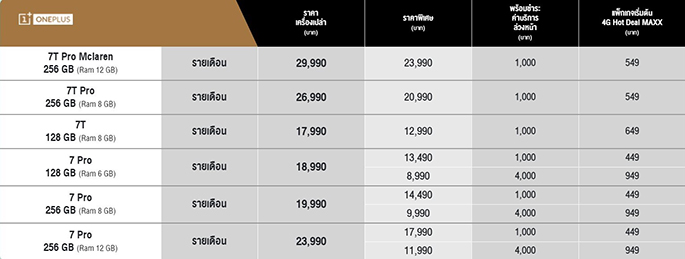สุดคุ้ม! ให้คุณเป็นเจ้าของ OnePlus 7 Pro รับส่วนลดค่าเครื่องสูงสุด 6,000 บาท เมื่อสมัครแพ็กเกจรายเดือนเริ่มต้นที่ 449 บาทต่อเดือนเท่านั้น โดยลูกค้าต้องชำระค่าบริการล่วงหน้า 1,000 บาท