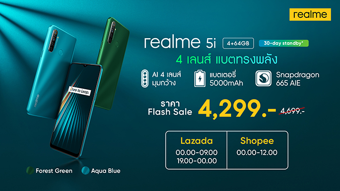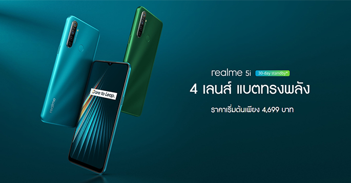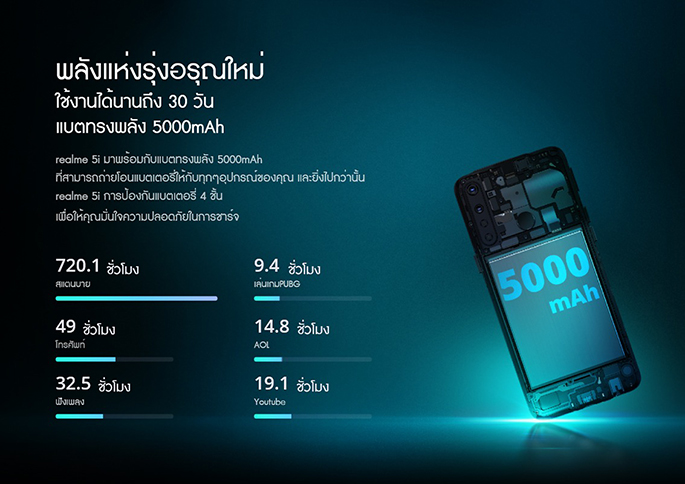 realme 5i สมาร์ทโฟน "4 เลนส์ แบตทรงพลัง" สมาชิกใหม่ในตระกูล realme 5 Series ที่มาพร้อมกับแบตเตอรี่ความจุสูงถึง 5,000 mAh รองรับการใช้งานได้นานถึง 30 วัน พร้อมสนุกมากยิ่งขึ้นด้วยกล้องหลัง AI 4 เลนส์ และดีไซน์ฝาหลังแบบใหม่ด้วยสไตล์ที่เป็นเอกลักษณ์