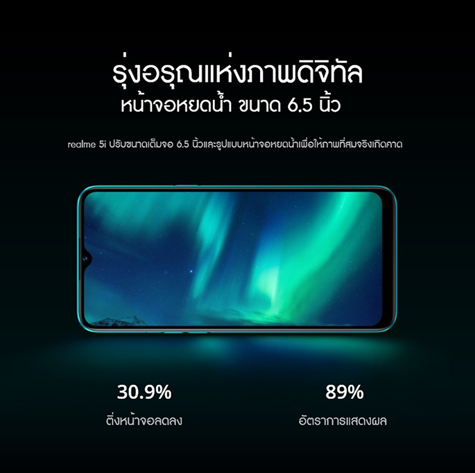 realme 5i มาพร้อมหน้าจอหยดน้ำ ขนาด 6.5 นิ้ว อัตราการแสดงผล 89% ทรงพลังด้วยชิปเซ็ต Snapdragon 665 ขนาด 11nm เสริมด้วย Octa-core ความเร็ว 2.0GHz ยกระดับประสบการณ์การเล่นเกมที่ลื่นไหล และหน่วยประมวลผล Qualcomm AI Engine รุ่นที่ 3 มอบประสิทธิภาพการทำงานอย่างดีที่สุดในระดับราคาเดียวกัน realme 5i มาพร้อมความจุ 4 + 64 GB และ 4 + 128 GB ที่สามารถเพิ่มพื้นที่ความจุ Micro SD ได้ถึง 256 GB