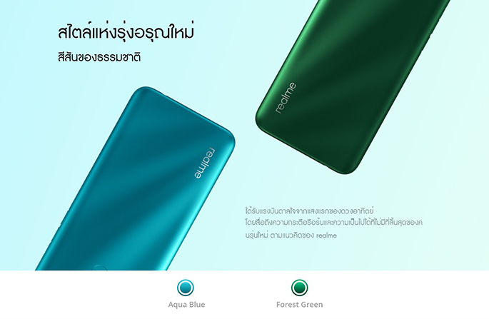 นอกจากนี้ realme 5i ยังมาพร้อมดีไซน์แบบใหม่ด้วยสไตล์ที่เป็นเอกลักษณ์โดยได้รับแรงบันดาลใจจากแสงแรกของดวงอาทิตย์ ซึ่งแสดงถึงพลังแห่งความหวังและความกระตือรือร้นที่ไม่มีที่สิ้นสุดของคนรุ่นใหม่ตามแนวคิดของ realme ฝาหลังของ realme 5i มีการขัดมันและแกะสลักเรเดียมโดยเทคโนโลยีเครื่องจักรประเภท 5 แกนที่มีความแม่นยำจากประเทศเยอรมนี และมีการขัดเงากว่า 600 นาที จนเกิดมาเป็นดีไซน์ที่สวยงามตามแบบฉบับของ realme 5i โดยมาพร้อม 2 สี ได้แก่ Aqua Blue และ Forest Green
