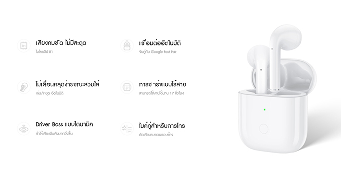 realme Buds Air ถือเป็นหูฟังไร้สายอย่างแท้จริง ด้วยการออกแบบที่เรียบง่ายไม่มีสายระโยงระยางเพิ่มความคล่องตัวในการใช้งาน ประมวลผลด้วยชิปเซ็ต R1 ที่มีความหน่วงต่ำ พร้อมกับการเชื่อมต่อแบบ Bluetooth 5.0 ที่ช่วยให้การเชื่อมต่อระหว่างหูฟังและสมาร์ทโฟนนั้นรวดเร็วและมีเสถียรภาพ อีกทั้งมาพร้อมการทำงานของแบตเตอรี่ที่ยาวนาน รองรับการใช้งาน Google Assistant และการสั่งการแบบอัจฉริยะที่คุณสามารถควบคุมการใช้งานได้อย่างสะดวกง่ายดาย