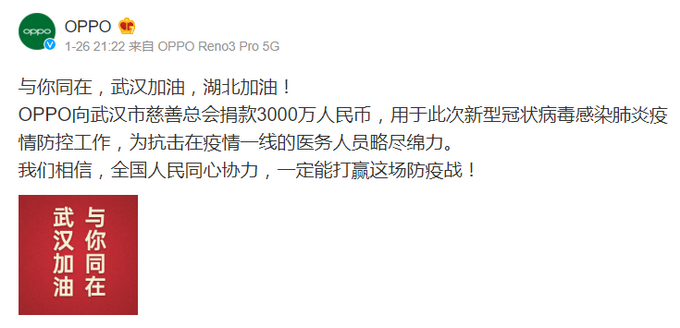 เนื่องด้วยสถานการณ์การระบาดของโรคปอดอักเสบจากเชื้อไวรัสโคโรนาสายพันธุ์ใหม่ 2019 (Novel Coronavirus 2019 Pneumonia) ที่มีแหล่งเริ่มต้นจากเมืองอู่ฮั่น ประเทศจีน มีการติดเชื้อและความรุนแรงถึงขั้นมีผู้เสียชีวิต OPPO ได้ร่วมกันบริจาคเงินกว่า 30 ล้านหยวน หรือราวๆ 132 ล้านบาทให้กับสหพันธ์การกุศลอู่ฮั่น (Wuhan Charity Federation) เพื่อเป็นการสนับสนุนการป้องกันการแพร่ระบาดของเชื้อไวรัสโคโรนาสายพันธุ์ใหม่ 2019 ทาง OPPO จะคอยเฝ้าติดตามสถานการณ์อย่างใกล้ชิด เราขอให้กำลังใจแก่ผู้ติดเชื้อให้ปลอดภัยโดยเร็ววัน และขอให้ทุกท่านสวมหน้ากากอนามัยในพื้นที่เสี่ยง และรักษาสุขภาพให้แข็งแรงอยู่เสมอ