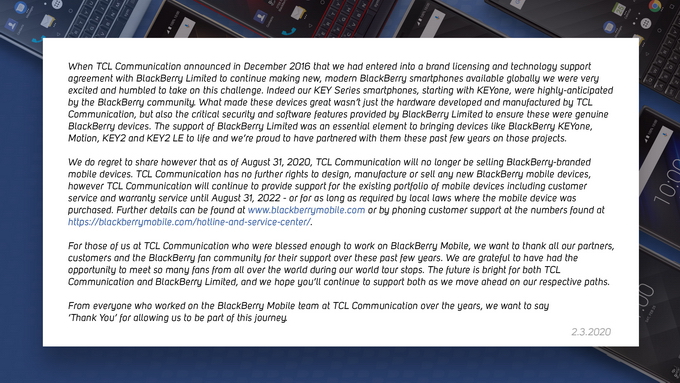 BlackBerry และ TCL จะสิ้นสุดสัญญา 31 สิงหาคม 2020 ที่จะถึงนี้ โดยหลังจากนี้ทางแบรนด์ TCL จะไม่มีสิทธิ์ในการออกแบบ และพัฒนาสมาร์ทโฟนของ BlackBerry อีกต่อไป สำหรับลูกค้าที่ซื้อสมาร์ทโฟนไปแล้ว ยังคงได้รับการประกันจาก TCL จนกว่าจะสิ้นสุดสัญญาซื้อขายตามปกติครับ