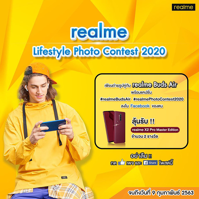 realme แบรนด์สมาร์ทโฟนเพื่อคนรุ่นใหม่จัดกิจกรรมสุดพิเศษเอาใจสาวก realme กับ realme Lifestyle Photo Contest 2020 กิจกรรมประกวดภาพถ่ายคู่กับหูฟัง "ตัวจริงการเชื่อต่อแบบไร้สาย realme Buds Air" ในคอนเซปต์ Lifestyle สะท้อนความเป็นตัวคุณผ่านหูฟังสุดพิเศษ realme Buds Air สำหรับภาพที่โดนใจคณะกรรมการมากที่สุดรับฟรี สมาร์ทโฟนพลังเรือธงสุดพิเศษ realme X2 Pro Master Edition สี Red Brick มูลค่า 19,999 บาท สามารถร่วมกิจกรรมได้แล้วตั้งแต่วันนี้ - 9 กุมภาพันธ์ 2563