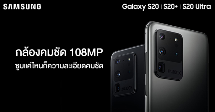 จัดเต็มอีกครั้ง มือถือเรือธงรุ่นใหม่ล่าสุด! เพียงจอง Samsung Galaxy S20 Series พร้อมพลังซูมเหนือระดับ Space Zoom สูงสุด 100 เท่า และหน้าจอ Dynamic AMOLED 120Hz ที่แสดงผลได้ลื่นไหล ตอบสนองการทัชที่รวดเร็ว และแม่นยำ แบตเตอรี่สูงสุด 5,000 mAh กันน้ำลึก 1.5 เมตร 30 นาที กล้องหลัง 4 เลนส์ระดับโปร ถ่ายวีดีโอ คุณภาพระดับ 8K โดยมีรายละเอียดราคาในแต่ละรุ่นดังนี้ Samsung Galaxy S20 ราคา 28,900 บาท Samsung Galaxy S20+ ราคา 31,900 บาท และ Samsung Galaxy S20 Ultra 5G ราคา 39,900 บาท สนใจจองที่ CSC หรือ IT Ctiy รับของสมนาคุณ ดังนี้
