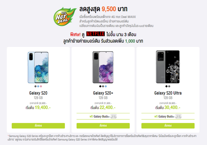 AIS เปิดจอง Samsung Galaxy S20, Galaxy S20+ และ Galaxy S20 Ultra สมาร์ทโฟนแฟลกชิปแห่งปี สั่งซื้อล่วงหน้าลดสูงสุด 9,500 บาท เมื่อซื้อเครื่องพร้อมแพ็กเกจ 4G Hot Deal MAXX สำหรับลูกค้าเปิดเบอร์ใหม่ ย้ายค่ายเบอร์เดิม เปลี่ยนจากเติมเงินเป็นรายเดือน และลูกค้าปัจจุบันในระบบรายเดือน พิเศษ! ดู Netflix ไม่อั้น นาน 3 เดือน และรับฟรี Samsung Galaxy Buds+ มูลค่า 4,990 บาท (สำหรับหูฟังเฉพาะ Samsung Galaxy S20+ และ Galaxy S20 Ultra เท่านั้น) ลูกค้าย้ายค่ายเบอร์เดิม รับส่วนลดเพิ่ม 1,000 บาท