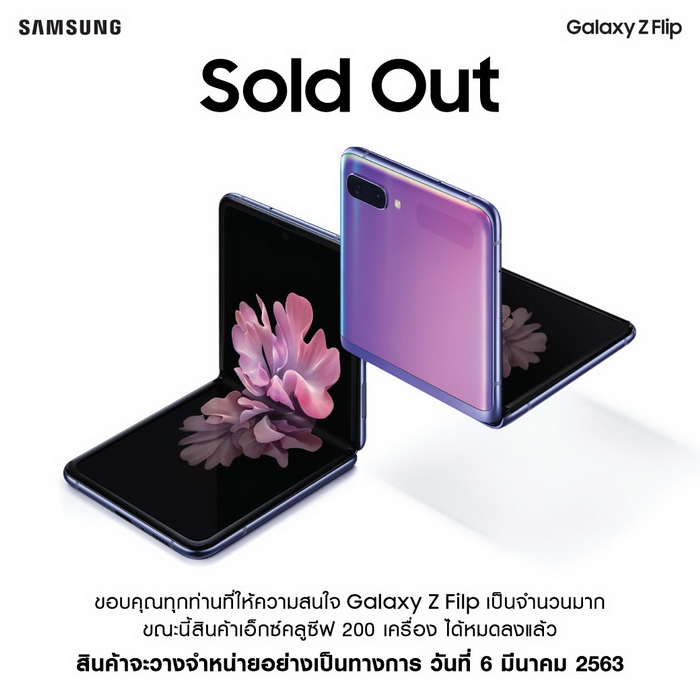ใครที่พลาด 200 เครื่องแรกไป ซัมซุงเตรียมวางจำหน่าย Samsung Galaxy Z Flip อย่างเป็นทางการในวันที่ 6 มีนาคม 2563 เป็นต้นไป ที่ Samsung Experience Store, Samsung Online Shop และผู้ให้บริการเครือข่าย มาในสีม่วง Mirror Purple และสีดำ Mirror Black ในราคา 44,900 บาท