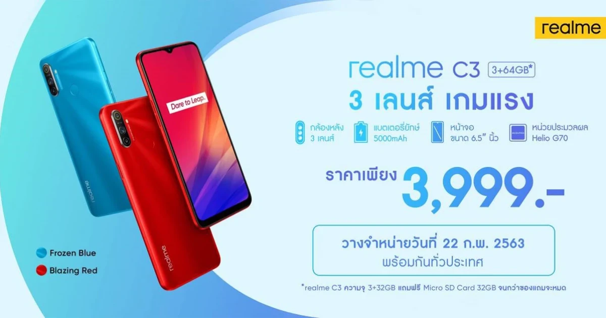 realme แบรนด์สมาร์ทโฟนเพื่อคนรุ่นใหม่ หลังส่งสมาร์ทโฟนน้องใหม่ล่าสุดในตระกูล C Series อย่าง realme C3 ออกมาและได้วางจำหน่ายที่แรกผ่านช่องทางออนไลน์อย่าง Lazada และ Shopee ซึ่งได้รับกระแสตอบรับอย่างดี ด้วยสเปคที่มาพร้อมกับคุณภาพ ในราคาเกินคุ้ม ล่าสุด realme C3 พร้อมแล้วที่จะวางจำหน่ายผ่านช่องทางออฟไลน์พร้อมกันทั่วประเทศ ตั้งแต่วันที่ 22 กุมภาพันธ์ 2563 เมื่อซื้อพร้อมแพคเกจสุดคุ้มจากเครือข่ายมือถือคุณภาพ AIS, TrueMove H และ dtac ในราคาเริ่มต้นเพียง 1,499 บาท จากราคาปกติ 3,999 บาท โดย AIS และ TrueMove H จะเริ่มวางจำหน่ายในวันที่ 3 มีนาคมเป็นต้นไป