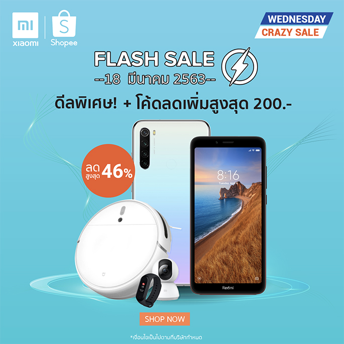 Xiaomi ประเทศไทย จับมือกับ Shopee เอาใจเหล่าสาวก Mi Fans ให้ได้เป็นเจ้าของสินค้าได้ง่าย ๆ กับแคมเปญช้อปปิ้งออนไลน์ "Weekly Wednesday Flash Sales" พร้อมส่วนลดสูงสุดมากถึง 46% เริ่มตั้งแต่เที่ยงคืนของวันที่ 18 มีนาคม 2563 เป็นต้นไป!