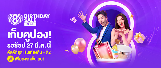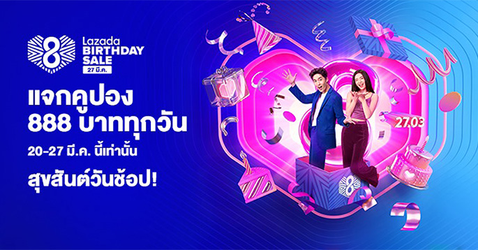 Lazada ฉลองครบรอบ 8 ปีอย่างยิ่งใหญ่ จัดมหกรรมช้อปทะลุโลกวันที่ 27 มีนาคม วันเดียวเท่านั้น พร้อมไฮไลต์จัดหนัก แจกคูปอง 888 บาททุกวัน พบสินค้าลดสูงสุด 90% และ Flash Sale เริ่มต้นเพียง 8 บาท พร้อมช้อปตาแตกตั้งแต่เที่ยงคืนกับสินค้าราคาดีที่สุดในรอบปีจากแบรนด์ดังร่วม 200 แบรนด์ อาทิ Xiaomi, Samsung, Wacoal, Adidas, Bobbi Brown, S-26 และ Whiskas พร้อมพบกิจกรรม Livestream จากดาราวัยรุ่นชื่อดังมากมายที่จะมาร่วมป้ายยาฉลองวันเกิดลาซาด้า ไม่ว่าจะเป็น ออฟ - จุมพล, กัน - อรรถพันธ์, มิว - ศุภศิษฏ์, กลัฟ - คณาวุฒิ, ไบร์ท - วชิรวิชญ์, วิน - เมธวิน, เพิร์ธ - ธนพนธ์, แปลน - รัฐวิทย์ และบลู - พงศ์ทิวัตถ์ ให้นักช้อปฉลองวันเกิดลาซาด้าแบบจุใจ ช้อปฉลองวนไป เหมือนวันเกิดเราเอง!