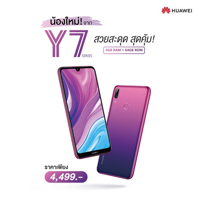 หัวเว่ย เปิดตัวสมาชิกใหม่ในกลุ่มสมาร์ทโฟนซีรี่ส์ Y สุดฮิต HUAWEI Y7 สวยสะดุด สุดคุ้ม! มาดีไซน์เรียบหรู ตอบโจทย์ทุกฟังก์ชันการใช้งานทั้งถ่ายรูปและการทำงานแบบ On the Go ในราคาเพียง 4,499 บาท พร้อมวางจำหน่ายตั้งแต่วันนี้เป็นต้นไป