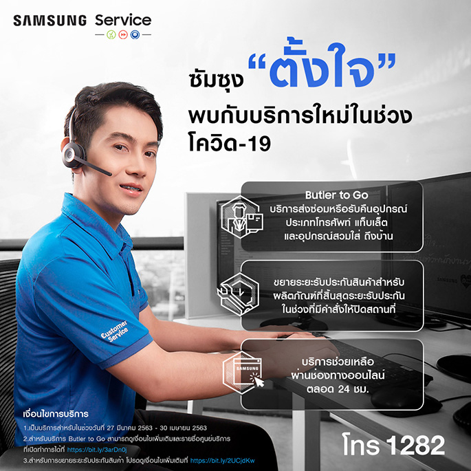- บริการดิจิทัลเซอร์วิส เพื่ออำนวยความสะดวกให้แก่ลูกค้าที่ต้องการใช้บริการซ่อมผลิตภัณฑ์ ซัมซุงจึงได้เปิดช่องทางการติดต่อออนไลน์แก่ลูกค้าของซัมซุงและผู้ที่สนใจใช้บริการหรือต้องการข้อมูลเพิ่มเติม ไม่ว่าจะเป็นการติดต่อสอบถามผ่านทางคอลเซ็นเตอร์ของซัมซุงเบอร์ 1282 หรือผ่านทาง Live chat ที่ www.samsung.com/th/support และแอปพลิเคชัน Samsung Members เพื่อปรึกษา ผู้เชี่ยวชาญซึ่งผ่านการอบรมจากซัมซุงแล้วเป็นอย่างดีได้ตลอด 24 ชั่วโมง และตรวจสอบเงื่อนไข การรับประกันสินค้าได้ที่ www.samsung.com/th/support/warranty สามารถใช้บริการทั้ง 3 ของซัมซุงได้ตั้งแต่วันนี้ จนถึงวันที่ 30 เมษายน 2563 นี้!