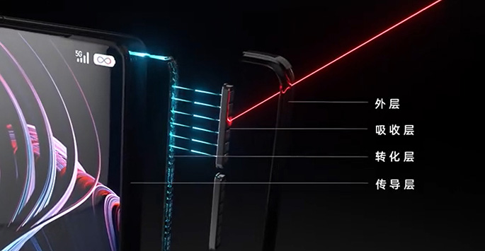 ในวิดีโอนี้ แสดงให้เห็นว่าบริเวณขอบเครื่องของ OPPO Ace Infinity จะมีการฝังขดลวด FreeVOOC coil และมีเลเยอร์ที่ทำหน้าที่ในการดูดจับกระแสไฟฟ้า, เลเยอร์สำหรับการแปลง และตัวนำไฟฟ้าที่จะช่วยให้สามารถชาร์จไฟแบตเตอรี่ได้ตลอดเวลา