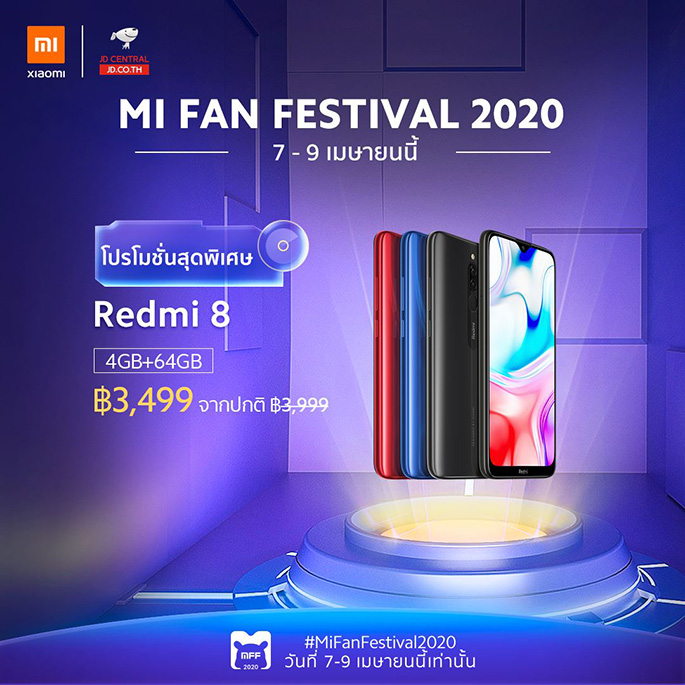 - Xiaomi Redmi 8 (ความจุ 4GB + 64GB) ลดราคาจากปกติ 3,999 บาท เหลือ 3,499 บาท