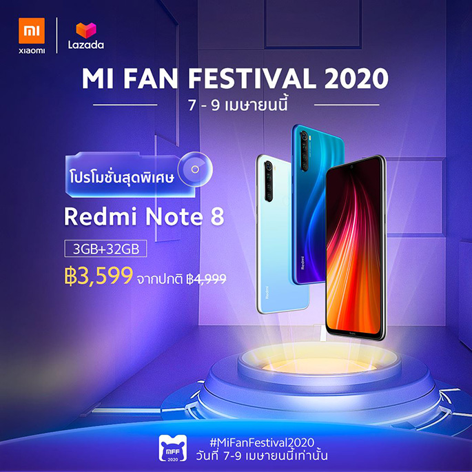 - Redmi Note 8 (ความจุ 3GB + 32GB) ลดราคาจากปกติ 4,999 บาท เหลือ 3,599 บาท