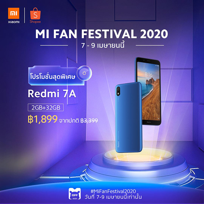 - Xiaomi Redmi 7A (ความจุ 2GB + 32GB) ลดราคาจากปกติ 3,399 บาท เหลือ 1,899 บาท