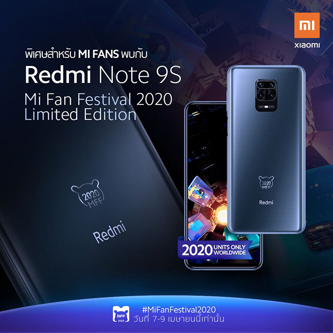 Redmi Note 9S รุ่น MFF-Limited Edition จะจำหน่ายในราคา 7,999 บาท ผ่านช่องทาง Lazada, Shopee และ JD Central ในวันที่ 7 เมษายน 2563 นี้