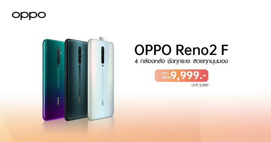 ใครๆ ก็สามารถเป็นเจ้าของสมาร์ทโฟนคุณภาพสุดเทพ ในราคาเบาๆ ได้ สำหรับใครที่ไม่อยากพลาดก็สามารถเป็นเจ้าของ OPPO Reno2 F ได้แล้วที่ OPPO Brand Shop และตัวแทนจำหน่ายทั่วประเทศ โดยราคานี้จะมีผลตั้งแต่วันที่ 1 พฤษภาคม 2563 เป็นต้นไป