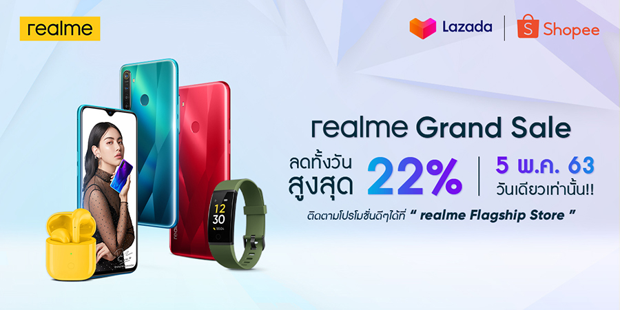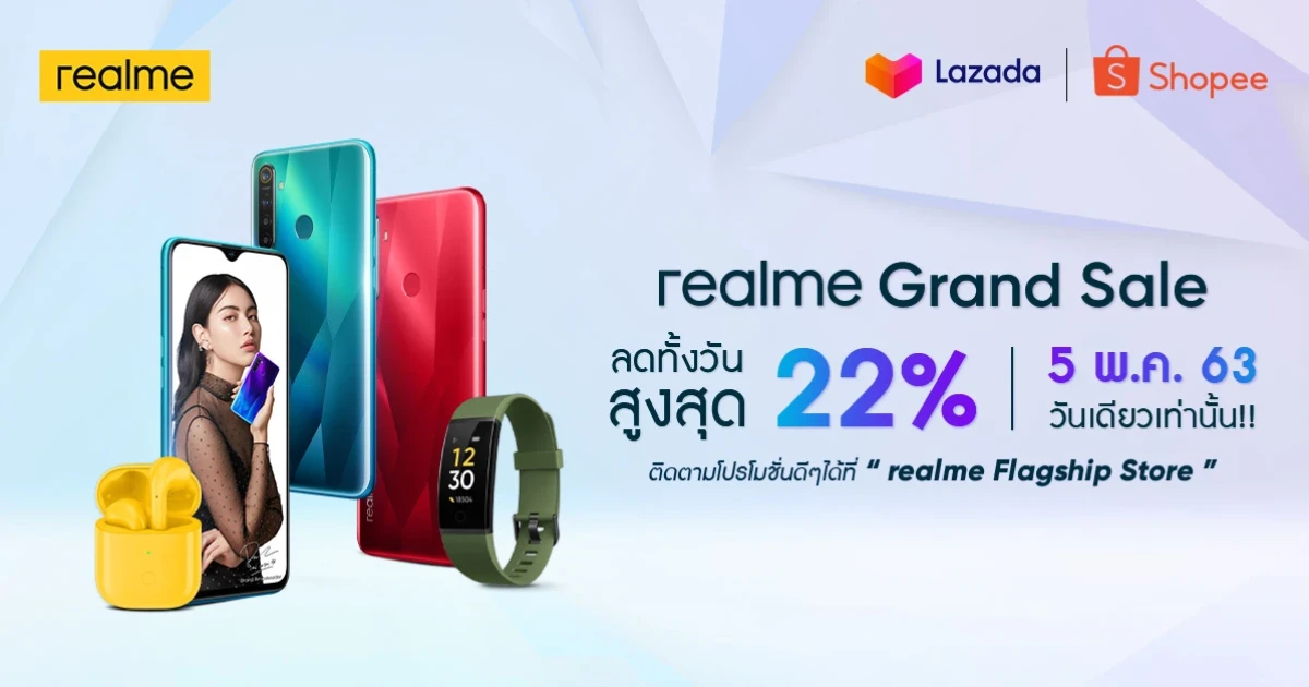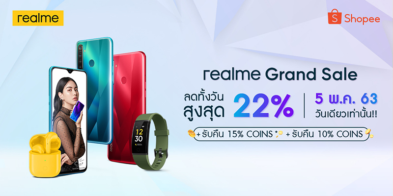 realme แบรนด์สมาร์ทโฟนเพื่อคนรุ่นใหม่ที่เติบโตเร็วที่สุดในโลก จัดมหกรรม realme Grand Sale แคมเปญลดราคาครั้งยิ่งใหญ่รับวันที่ 5 เดือน 5 เตรียมพบกับผลิตภัณฑ์สเปคจัดเต็ม ทั้งสมาร์ทโฟนและอุปกรณ์ AIoT ในราคาลดสุดพิเศษ นอกจากนี้ยังได้ลุ้น Surprise Deals ตลอดทั้งวัน ลดราคาสูงสุดถึง 2,000 บาท พร้อม Voucher ลดเพิ่มสูงสุดอีก 400 บาท และรับคืนทันทีสูงสุด 15% Coins เฉพาะ realme Store ที่ Shopee และ Lazada ในวันที่ 5 พฤษภาคม 2563 วันเดียวเท่านั้น!