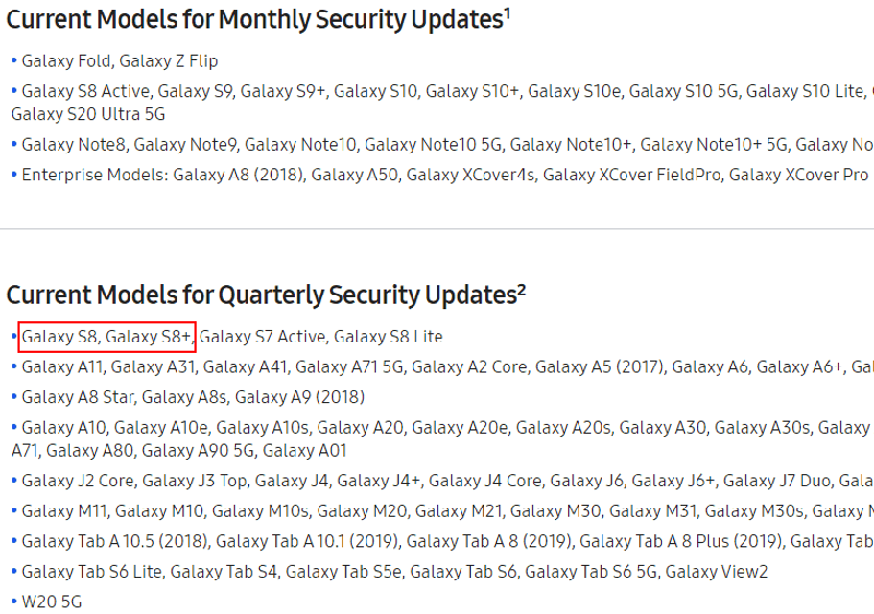 สำหรับ Samsung Galaxy S8 Series ถูกเปิดตัวและวางจำหน่ายมาตั้งแต่ช่วงเดือนเมษายน 2017 โดยมาพร้อม Android 7.0 Nougat และได้รับอัปเดทขึ้น Android 9.0 Pie พร้อม One UI เวอร์ชั่นแรกเมื่อปีที่แล้ว ซึ่งมีอายุในตลาดมากกว่า 3 ปีแล้ว แต่ปัจจุบันยังคงได้รับการซัพพอร์ตเรื่องของแพทความปลอดภัยจากซัมซุงอยู่ เพียงแต่ล่าสุดมีการปรับเปลี่ยนไทม์ไลน์การซัพพอร์ตใหม่ โดยเปลี่ยนจากการอัปเดทแบบรายเดือนมาเป็นรายไตรมาสแทน (ทุกๆ 3 เดือน) เป็นการยืนยันว่าสมาร์ทโฟน S Series ของซัมซุงมีแนวโน้มที่จะได้รับการซัพพอร์ตเกิน 2 ปี ตามมาตรฐานสมาร์ทโฟน Android ของ Google เหมือนที่ทางซัมซุงเคยได้กล่าวว่า พวกเขาจะพยายามซัพพอร์ตสมาร์ทโฟน Flagship อย่าง S กับ Note Series ให้นานที่สุดเท่าที่จะทำได้