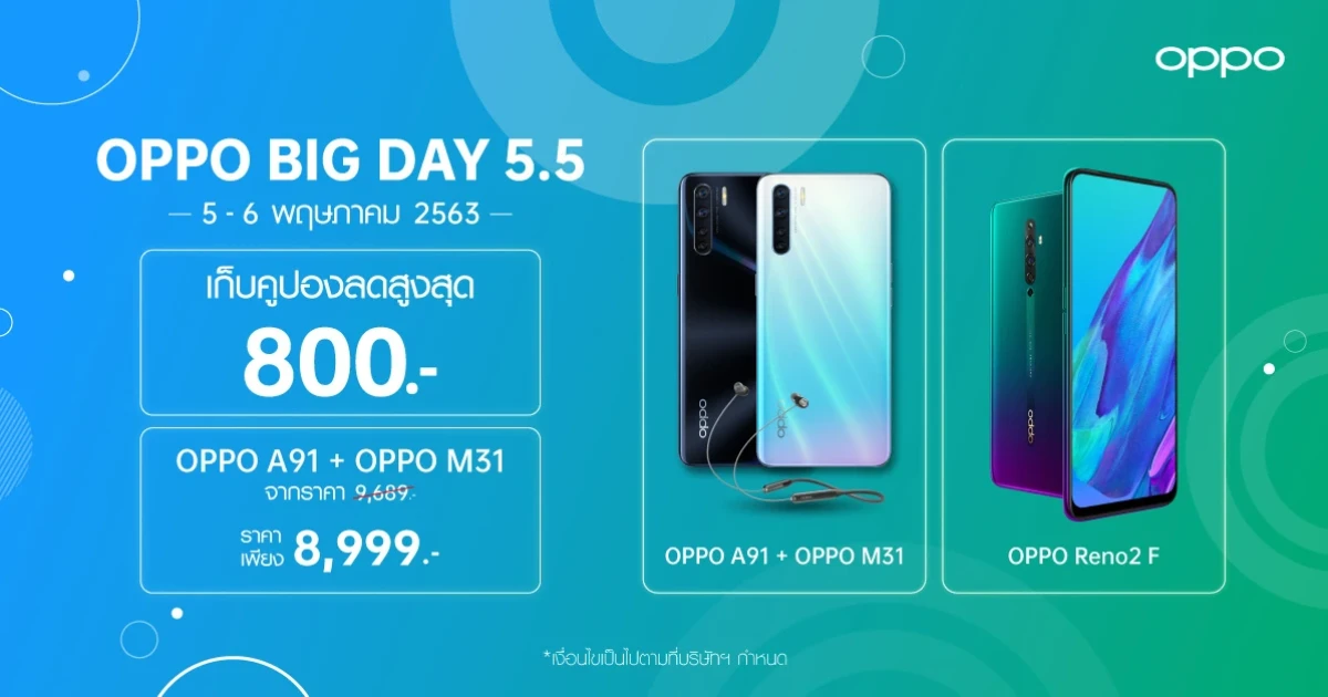 OPPO มอบโปรโมชั่นแรง! ต้อนรับเดือนพฤษภาคม ผ่านแคมเปญ OPPO BIG DAY 5.5 ในช่องทางออนไลน์ Lazada, Shopee และ JD Central เมื่อซื้อสมาร์ทโฟนและอุปกรณ์เสริมจาก OPPO ครบ 8,000 บาท รับส่วนลดไปเลย 800 บาท! และเมื่อซื้อครบ 4,000 บาท รับส่วนลด 300 บาท! โดยเงื่อนไขเป็นไปตามที่บริษัทฯ กำหนด ตั้งแต่วันที่ 5 - 6 พฤษภาคม 2563 พร้อมส่วนลดอีกเพียบ! ดังนี้