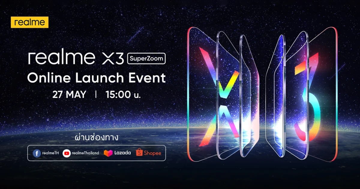 เตรียมตัวให้พร้อมกับการเปิดตัวออนไลน์ในวันที่ 27 พฤษภาคมนี้ เวลา 15:00 น. ผ่านช่องทางเพจ realme TH, Youtube Channel : realmeThailand และ Lazada ติดตามความพิเศษต่างๆ เกี่ยวกับ realme X3 SuperZoom ได้ทางเพจ realme TH : www.facebook.com/realmeTH