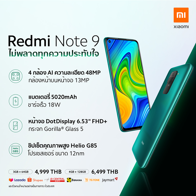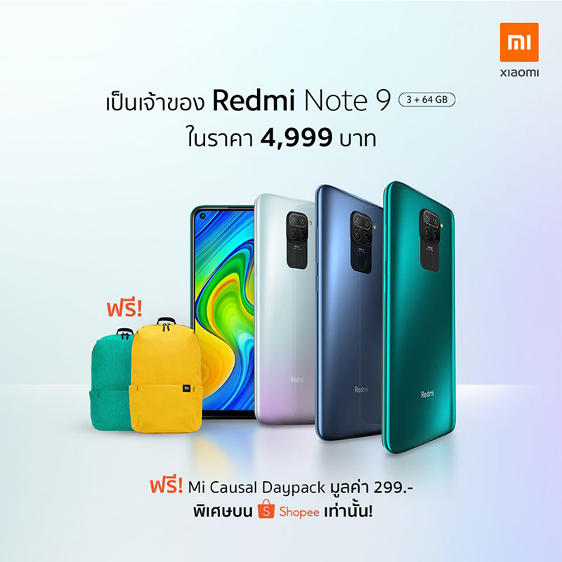 - Redmi Note 9 ความจุขนาด 4GB + 128GB มีให้เลือก 3 เฉดสี Midnight Grey, Forest Green และ Polar White ในราคาพิเศษ 6,499 บาท พร้อมรับฟรีของแถมสุดพิเศษ Xiaomi Mi Casual Daypack มูลค่ารวม 299 บาท ของมีจำนวนจำกัด