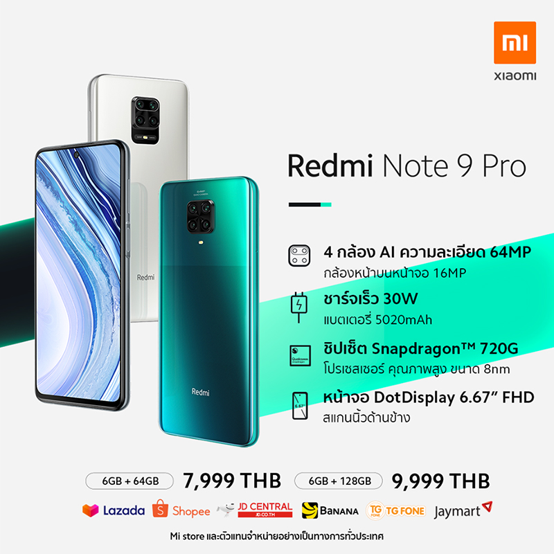 - Redmi Note 9 Pro ความจุขนาด 6GB + 64GB มีให้เลือก 3 เฉดสี Interstellar Grey, Glacier White และTropical Green ราคา 7,999 บาทพร้อมรับฟรี ของแถมสุดพิเศษ Xiaomi Mi True Wireless Earbuds Basicมูลค่ารวมกว่า 699 บาท ของมีจำนวนจำกัด