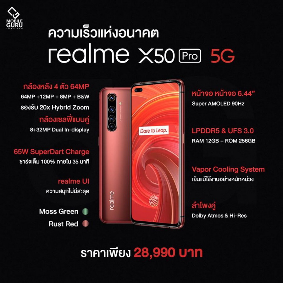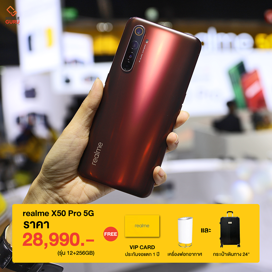 realme X50 Pro 5G มีให้เลือก 2 สีได้แก่ Moss Green, Rust Red ราคา 28,990 บาท รับฟรีทันที! เครื่องทำฟอกอากาศ กระเป๋าเดินทางขนาด 24 นิ้ว realme VIP Card รับประกันจอแตกนาน 1 ปี ที่งาน Thailand Mobile EXPO 2020 บูธ realme (PL4) ศูนย์ประชุม BITEC บางนา Hall 98-99 วันที่ 2 - 5 ก.ค. 63 เวลา 10.00 - 20.00 น.