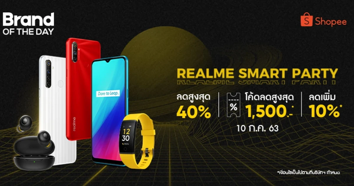 realme Smart Party ลดสูงสุด 40% พร้อมแจก Surprise Vouncher ทั้งวันสูงสุด 1,500 บาท วันที่ 10 ก.ค. 63 เวลา 00:00 น. ถึง 23:59 น. ทาง realme Official Shop ที่ Shopee เท่านั้น! นอกจากนี้สำหรับ 115 คำสั่งซื้อแรกสำหรับซื้อสมาร์ทโฟนรับของรางวัลสุดพิเศษมูลค่ารวมมากกว่า 100,000 บาท!