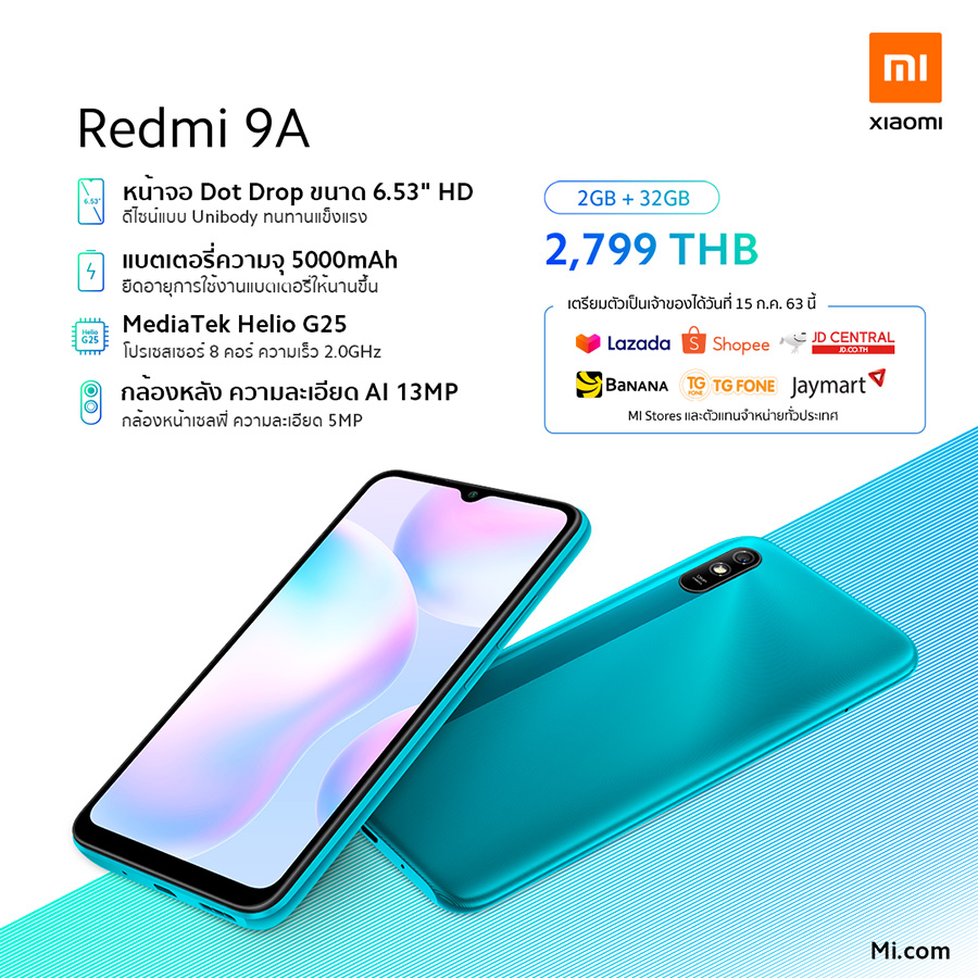 Xiaomi Redmi 9A สมาร์ทโฟนระดับต้นที่มาพร้อมหน้าจอขนาดใหญ่ 6.53 นิ้ว แบบ Dot Drop และแบตเตอรี่ขนาดใหญ่ 5,000 mAh ใช้ระบบประมวลผลทรงพลัง MediaTek Helio G25 พร้อมกล้องหลัง AI ความละเอียด 13 ล้านพิกเซล ในราคา 2,799 บาท