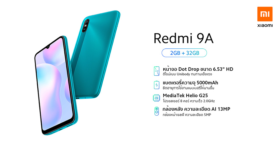 Xiaomi Redmi 9A มาพร้อมหน้าจอ Dot Drop ขนาดใหญ่ 6.53 นิ้ว ระบบประมวลผลทรงพลัง MediaTek Helio G25 ชิปเซ็ตเกมมิ่ง Octa-core ให้ประสบการณ์การใช้งานที่ลื่นไหลตลอดทั้งวัน กล้องหลัง AI ความละเอียด 13 ล้านพิกเซล ถ่ายภาพได้รวดเร็ว สวยคมชัดในทุกสถานการณ์ และแบตเตอรี่ขนาดใหญ่จุใจ 5,000 mAh