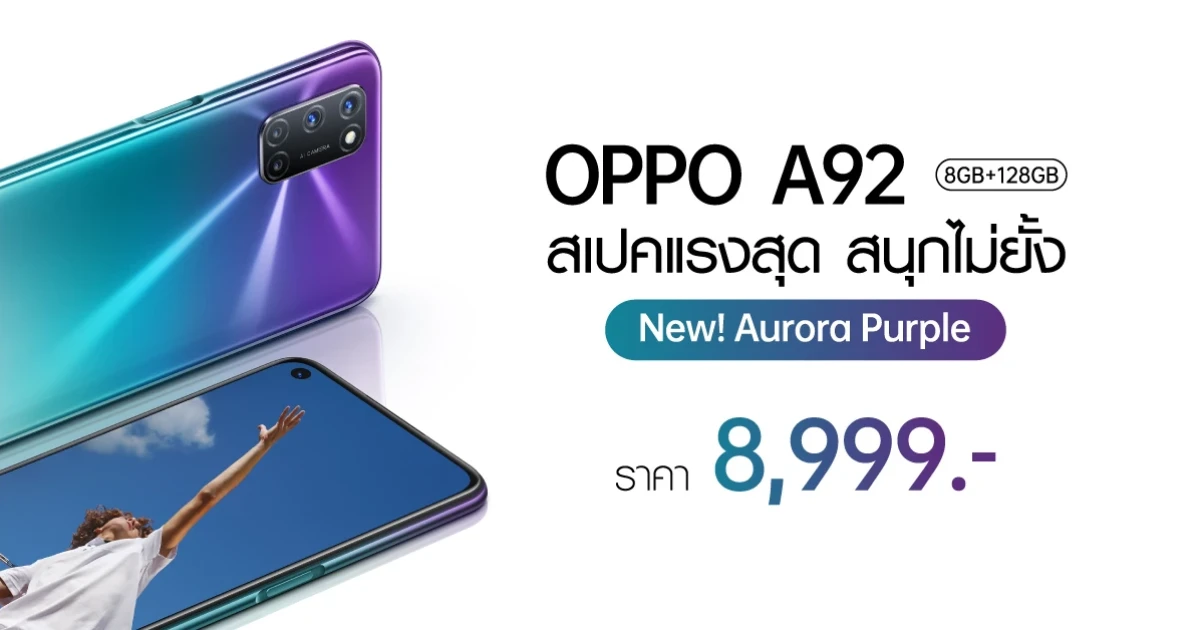 OPPO A92 สีใหม่ Aurora Purple (สีม่วง) สมาร์ทโฟนน้องใหม่ "สเปคแรงสุด สนุกไม่ยั้ง" จาก A Series พร้อมตอบโจทย์ทุกการใช้งาน วางจำหน่ายอย่างเป็นทางการแล้ว ในราคา 8,999 บาท